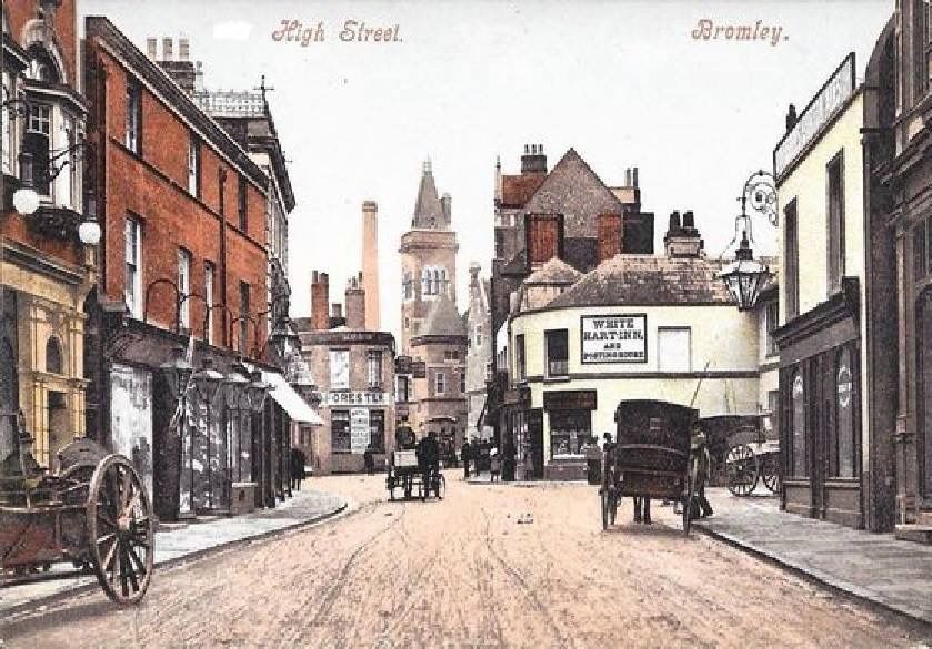 Bromley itself was the first big town before reaching London that travellers from Kent, Sussex and other parts of the South East of England would stop at. The Bell Hotel would accommodate those on their way to and from the city. In fact, Lady Catherine de Bourgh in Jane Austen’s Pride and Prejudice mentions it to Elizabeth Bennett; “Where shall you change horses? Oh! Bromley, of course. If you mention my name at the Bell, you will be attended to.” (Austen, 1813.) Originally the Bell Hotel, located just North of Bromley Market Square, was a 1666 hostelry but by 1890 the front was falling down and was rebuilt in 1898 along with the rest of the High Street that you can see a lot of today. Jane Austen travelled often from Hampshire to visit her brother in Kent and would most certainly have stopped in Bromley.